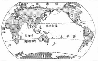 (1)A地的气候是____ _,A地气候与J地气候差异如此之大,主要影响因素是 因素。