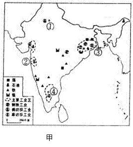 (3)甲国①②③④四个城市中, (填数码)是新兴工业为主的的城市。最大的棉纺织工业中心是 (填数码及名称)。