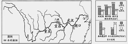 (3)据图分析,20世纪90年代长江流域森林覆盖率、湖泊面积比50年代减小,而水土流失面积在增大,造成这种现象的人为原因主要是_________________,这给下游河段带来的影响主要有________________ 等。