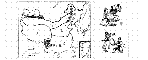 (3)右图中甲、乙两个少数民族主要分布于天山附近的是 ,这个少数民族是 族。(2分)