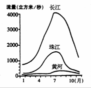 (2)长江、珠江比黄河的汛期长、流量大,请列举造成这种现象的两种原因:汛期长因为 ,流量大因为 。