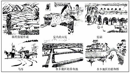 D.窑洞、马车、水乡地区的养鱼池、水乡的船和桥