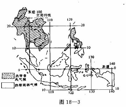 (1)读图(18-3),在图中找到北回归线和南纬10°两条纬线,由此可见,东南亚绝大部分地区地处___________(五带之中),并且四周环海,深受海洋的影响。