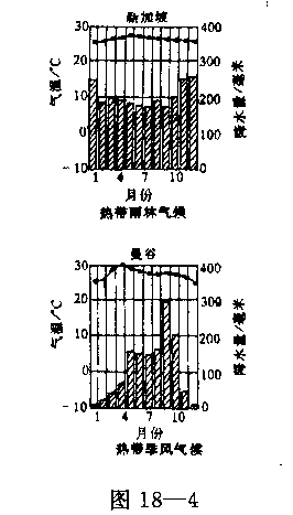 2.读图(18-3)、(18-4),东南亚气候类型分布图及热带雨林气候、热带季风气候气温曲线