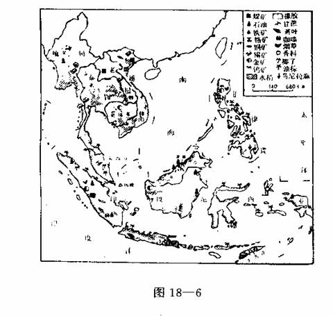 3.读图(18-5)、(18-6)及表格,概括东南亚物产特点,并简单分析原因。
