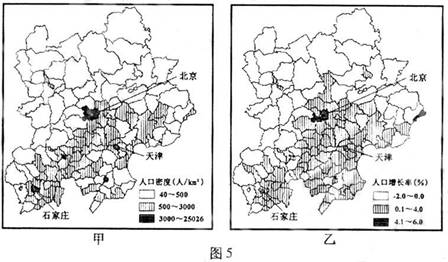 图5甲、乙分别示意京津冀都市圈2000年人口密度分布和人口增长率。完成以下2题。