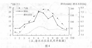 图4是某地气温、降水、潜水水位(潜水面海拔)年内变化图。读图回答以下2题。