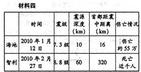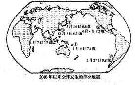 材料一2010年以来世界上发生了一系列强烈地震。图中显示了其中六次大地震的时闸、地点和震级。