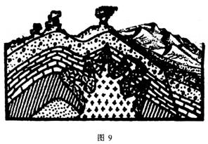 3.读图9,“我国西北内陆某地地质剖面及景观图”,完成下列要求:(10分)