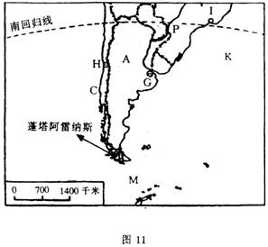 5.科学家首次观测到一个城市遭受臭氧层空洞的影响:南极上空一个臭氧层空洞已扩大到智利南部城市蓬塔阿雷纳斯(54°S,72°W)上空(见图11),据此回答下列问题:(10分)