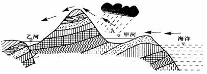 (3)乙处地质构造为 ,乙处发育成河流,主要是因为该处岩石 ,