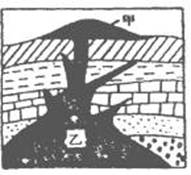 ①甲处为喷出岩,含有化石 ②乙处为侵入岩
