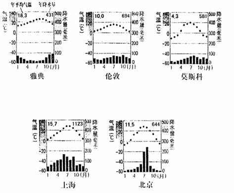 (2)下面的气温曲线和降水量柱状图表,分别代表了上面五种气候类型,将代表各气候类