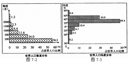 (2004年上海高考卷)世界人口分布极不平衡,但具有一定的趋向性,读图7-2、图7-3、图7-4回答: