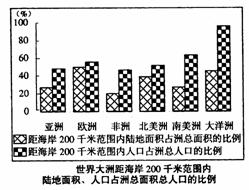 (3)分析图7-4,在距海岸200千米范围内陆地面积占洲总面积比例小于30%的大洲中,人口占总人口比例最大的是 洲。