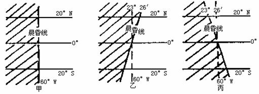 (1)甲、乙、丙三幅图中,表示春分日晨昏线与经线关系的是图 ;表示夏至日晨