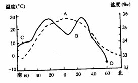 (1)表示海洋表面平均盐度按纬度分布的曲线是图中的 曲线;表示海洋表面平均温度按纬度分布的曲线是图中的 曲线。