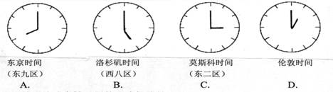 12. 2003年10月15日北京时间9点整,在酒泉卫星发射中心成功发射了“神州”五号载人飞船,这是我国航天史上的又一个重要的里程碑,此刻某宾馆墙上的四座时钟指示的钟点错误的是