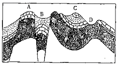 (1)图中A、B、C、D四处,属于背斜的是 ,属于向斜的是 。