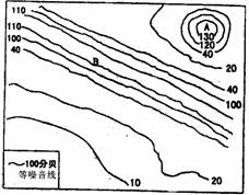 最近,英国科学家研制出了一种噪音地图。假如下图为某城市噪音地图的局部,图中曲线为等噪音量线(单位:分贝)。据此回答7-8。