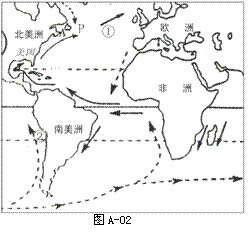读图A-02“世界洋流分布局部图”,回答9-10题。