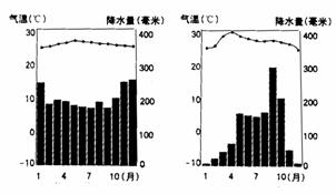 ⑷下面两幅气温降水柱状图(图2)分别反映何种气候类型的特点。