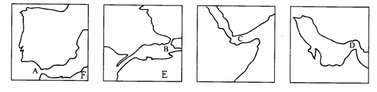 (2)沟通阿拉伯海和红海的海峡是 ,图中代号是 ;沟通地中海和大西洋的海峡是 ,代号是 ;跨越两大洲又位于同一个国家内的海峡是 ,图中代号是 ;周围沙漠气候广布,附近又盛产石油的海峡是 ,图中代号是 。