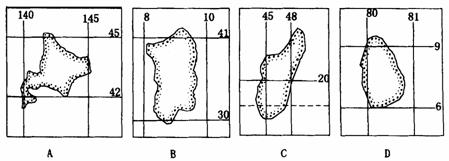 读四幅岛屿图,将各岛的字母填在相应的空格内: