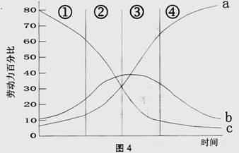 50.图4中A、b、c三条曲线,表示工业和服务业的劳动力比例变化曲线分别是