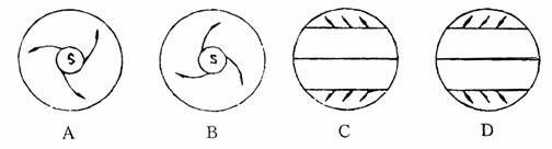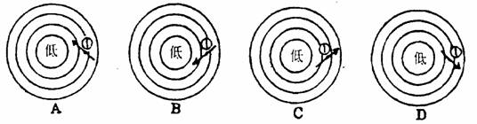 19、下图表示①地处于北半球的低压区,箭头表示①地风向。四幅图中风向正确的是: