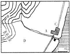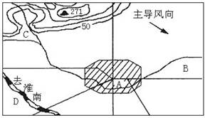 32(18分)下图为某城市的布局规划图,该城市要建发电厂、自来水厂、印染厂、服装厂以及城市的副食品供应基地和绿化带,要求在A、B、C、D四点中选择宜于建厂的地址(副食品供应地、绿化带建在城市的不同方位),并说明理由。