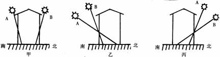 8、下图,甲、乙、丙三幅图反映了地处不同纬度的三座房屋冬、夏至阳光照射情况,每幅图中都画出了冬至和夏至两个节气的阳光,用A或B表示。下列判断正确的是: