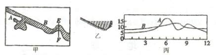 下图中甲是我国东部河流某河段示意图,乙是EF河段河床示意圈,丙是河流A、B两水