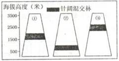 读右面①(115°E,26°N)、②(128°E,42°N)、③(90°E,43°N)三个地点的山地针阔混交林垂直分布示意图,回答21-22题。