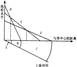 读“各类土地利用付租能力随距离递减示意图”,D、E、F表示的是商业区、住宅区、工业区,分析回答:(10分)