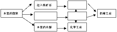 (2)鲁尔区五大传统工业部门除了机械工业和化学工业外,还有:A煤炭工业、B钢铁工业 、C 电力工业,请将在这些工业部门的字母填入下图空格中:
