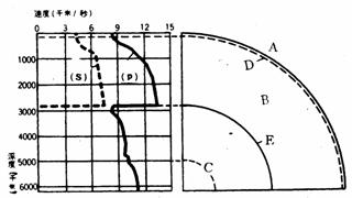 (1)图中地震波速度变化线中(S)表示横波。能在空气中传递的是S。