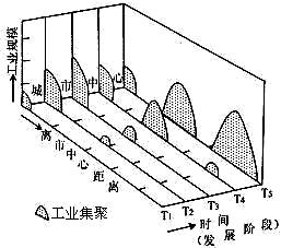 读某城市工业集聚规模随时间变化示意图,完成56-57题。