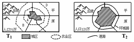 (3)若干年后T1所示城市发展到T2所示规模,图中反映了城市化过程中