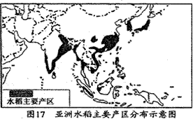 42.读亚洲水稻主要产区分布示意图,完成下列各题。(8分)