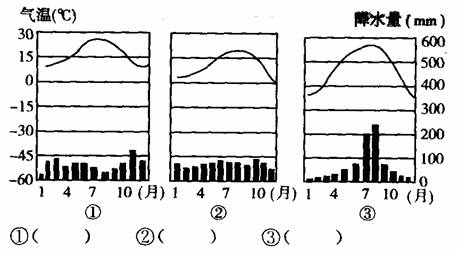(4)下图为A、B、C地三种气候类型的气温曲线和降水量柱状图,把气候类型的代表字母填人各序号后面的括号