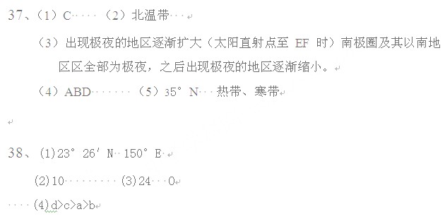 (4)a、b、c、d四地正午太阳高度由大到小的排列顺序是_______ 。(2分)