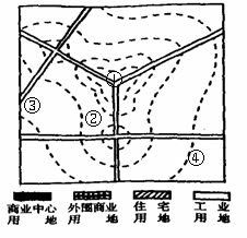 (1)市中心应为图中A.B.C中的 ;这里最适合的城市功能用地应为__ __区。
