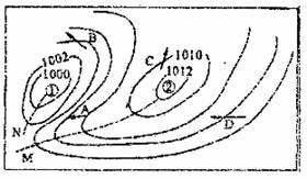 (2)、图中①、②两处就气压分布状况而言,分别称为 和 。就气流运动形式而言,分别称 和 。