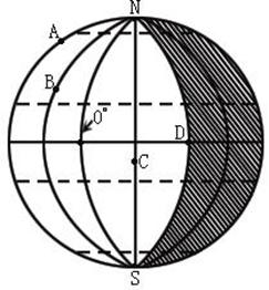 35.读“太阳光照图”(阴影部分表示夜半球)如图,并完成下列各题。(图中每格300经度为一个等份)(18分)