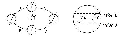 1.假设图中表示纬线圈乙A、B、C、D四点将纬线圈平分为四段弧,其中AB为夜弧,其余各弧为昼弧, 下列有关地球上的方向和太阳直射点的说法正确的是
