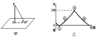 38.某校(100ºE)地理兴趣小组用立竿见影的方法测算正午太阳高度。如下图(甲)所示,垂直竖立一根2米长的竿OP,正午时测得竿影长OP′。右下图(乙)是该小组绘制的连续一年多的竿影长度及方向变化图。读图回答下列问题。(10分)