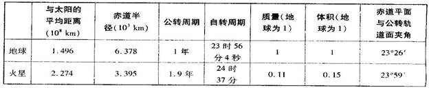按地球的有关概念,将火星与地球比较可得出下表,据此回答23-24题。