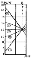 右图各线示意不同纬度①-⑤地的白昼长度变化。