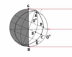 解析:由于A、B、C、D四点位于同一纬线上,而且从图中标出的地球自转方向不难看出A位于B的正东方;由图中地球自转方向可知图示表示的是北半球,而此时北半球昼弧长而夜弧短,可知此时太阳直射点在北半球。据题干知A、B、C、D平分纬线圈,故四地经度差为90°,可知夜弧长度为90°,夜长为6小时,日出时间为3时,四地位于同一纬线上,日出日落地方时刻相同。